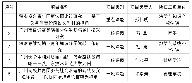 经公开申报、资料审查及专家评审,近日,2021年度广州青年与共青团工作课题予以立项,全市共有51个项目批准立项,其中重点课题10个,一般课题41个。我校5项课题获得立项,其中重点课题1项,一般课题4项。立项情况如下表: